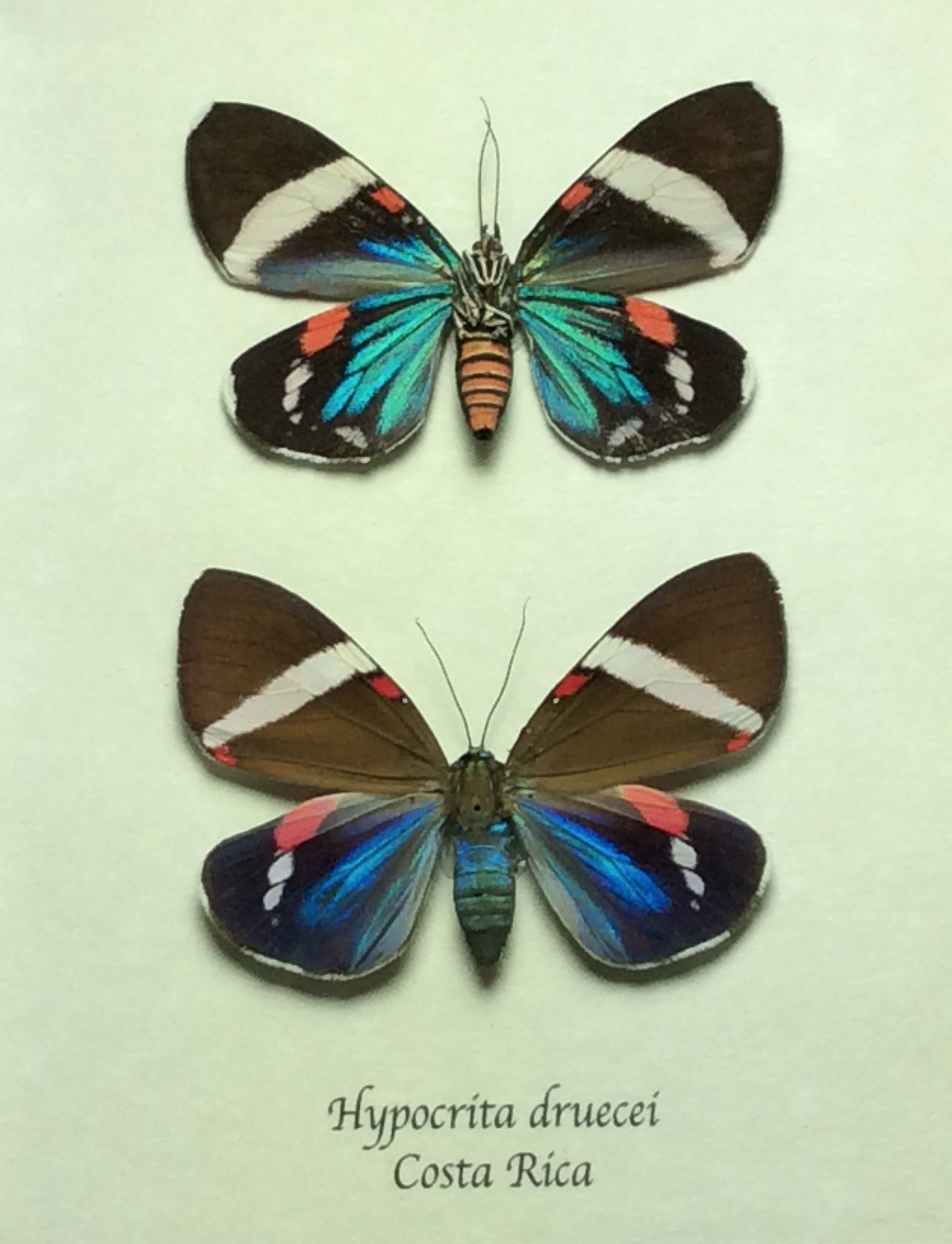 Description: Rare hard to get colorful metallic day flying moths set showing the front and back of the moth. Hypocrita drucei from Costa Rica.
