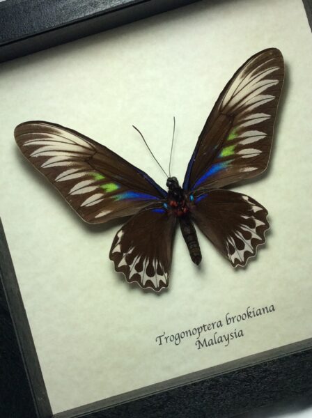 Description: Extra large Trogonoptera brookiana is commonly known as the Rajah Brooke’s Birdwing. It is a large green and black butterfly from Borneo, Sumatra, and the Thai-Malay peninsula. Birdwing butterflies are some of the most desirable specimens in the insect world. These large and striking butterflies are found only in small areas in Southeast Asia and the Pacific, with many being extremely rare.
