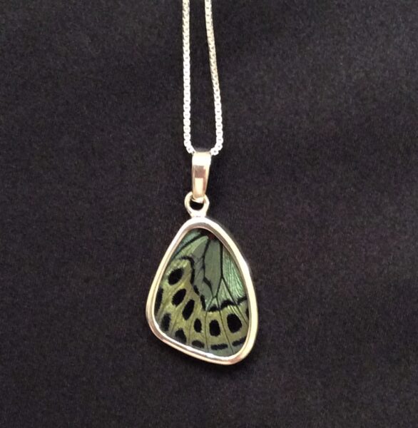 This sterling silver pendant necklace features a forward and verso view of a real butterfly wing. The Callithea Philotmia butterfly, commonly known as the Charles Darwin Butterfly, has iridescent colors of green, gold with black pattern markings and a blue/silver verso. This butterfly was a favorite of naturalist Charles Darwin. These pendants are hardy and will retain their vibrant long lasting colors. We ask that you avoid exposing them to moisture, which includes lotions and perfumes, along with prolonged exposure to hot direct sunlight. The pendant is Handmade in Peru and comes on a 16″ sterling silver box chain which is marked “.925 Italy”. The pendant you receive may vary slightly from the picture as this is nature and no two are exactly alike.