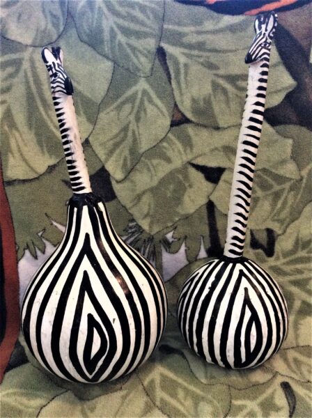This pair of preowned vintage African Maracas are handcrafted from dried gourds and have hand carved wood handles. Each gourd has been hand painted in black and white zebra stripes. The wood handle ends are carved zebra heads. The larger gourd measures about 6″ in diameter and is 12″ tall. The smaller gourd measures about 5″ in diameter and is 13″ tall. Each one has their own unique sound. These will make a fun and unusual addition to your home decor.